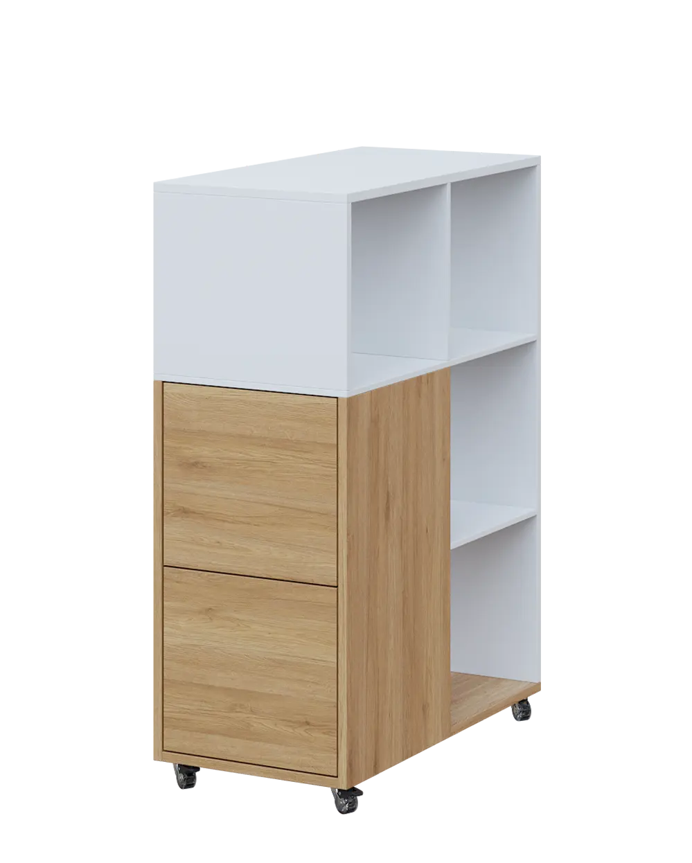 Skříňky z řady AERO lze skvěle kombinovat se stoly tak, aby se vytvořily pracovní prostory v několika výškových rovinách. Pomocí koleček lze vytvářet sestavy dle aktuální potřeby. Pohledová zadní část skříní umožní rozestavění do prostoru.