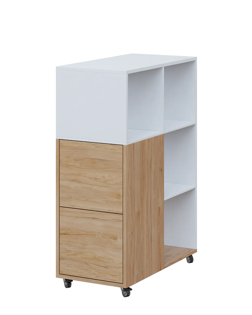 Skříňky z řady AERO lze skvěle kombinovat se stoly tak, aby se vytvořily pracovní prostory v několika výškových rovinách. Pomocí koleček lze vytvářet sestavy dle aktuální potřeby. Pohledová zadní část skříní umožní rozestavění do prostoru.