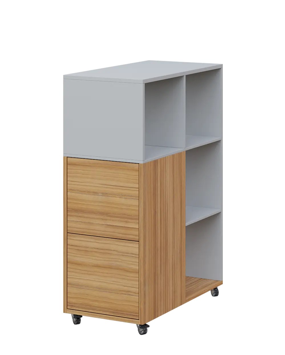 Skříňky z řady AERO lze skvěle kombinovat se stoly tak, aby se vytvořily pracovní prostory v několika výškových rovinách. Pomocí koleček lze vytvářet sestavy dle aktuální potřeby. Pohledová zadní část skříní umožní rozestavění do prostoru.