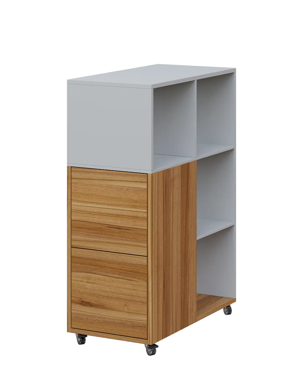 Skříňky z řady AERO lze skvěle kombinovat se stoly tak, aby se vytvořily pracovní prostory v několika výškových rovinách. Pomocí koleček lze vytvářet sestavy dle aktuální potřeby. Pohledová zadní část skříní umožní rozestavění do prostoru.