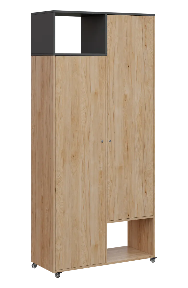 Skříňky z řady AERO lze skvěle kombinovat se stoly tak, aby se vytvořily pracovní prostory v několika výškových rovinách. Pomocí koleček lze vytvářet sestavy dle aktuální potřeby. Pohledová zadní část skříní umožní rozestavění do prostoru.