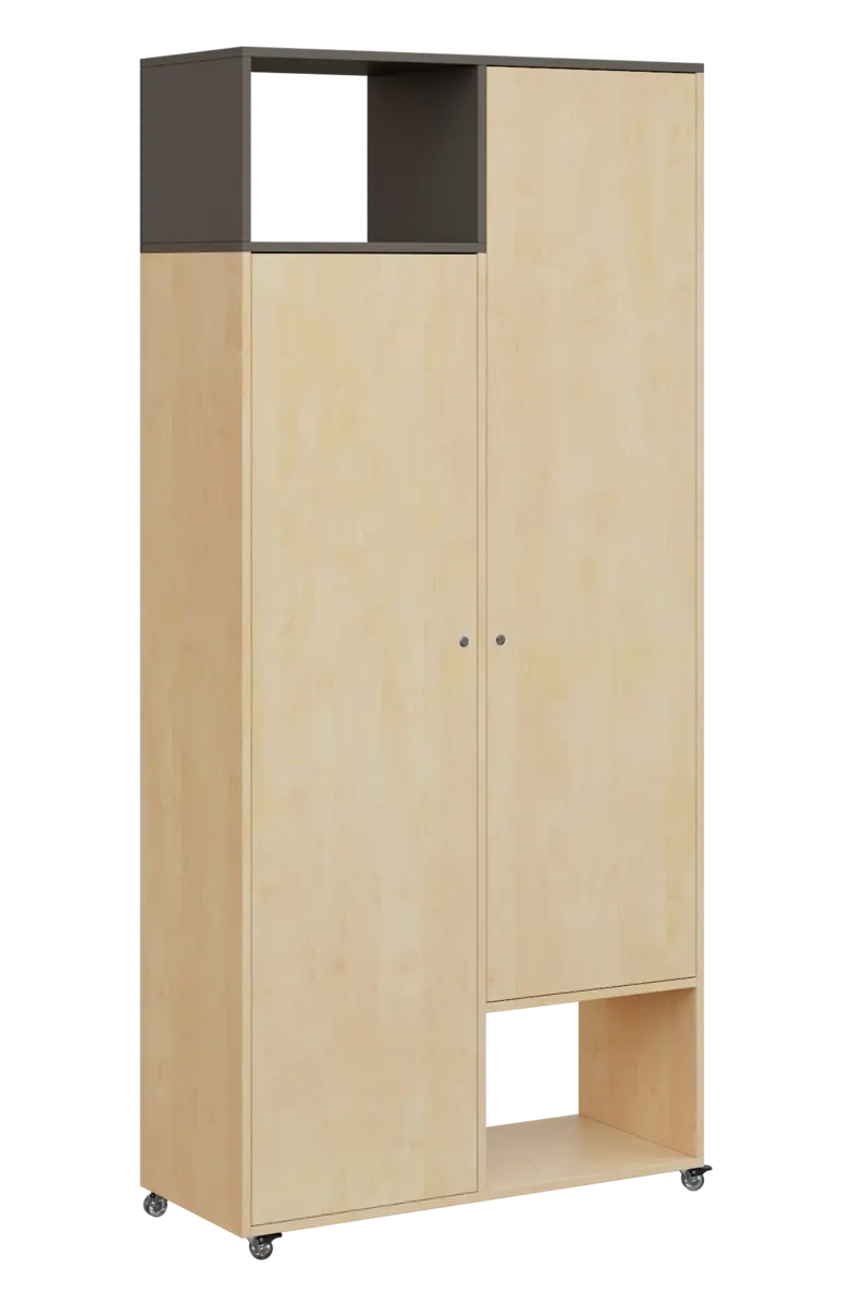 Skříňky z řady AERO lze skvěle kombinovat se stoly tak, aby se vytvořily pracovní prostory v několika výškových rovinách. Pomocí koleček lze vytvářet sestavy dle aktuální potřeby. Pohledová zadní část skříní umožní rozestavění do prostoru.