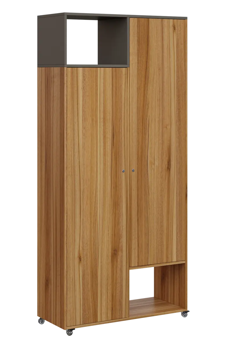Skříňky z řady AERO lze skvěle kombinovat se stoly tak, aby se vytvořily pracovní prostory v několika výškových rovinách. Pomocí koleček lze vytvářet sestavy dle aktuální potřeby. Pohledová zadní část skříní umožní rozestavění do prostoru.