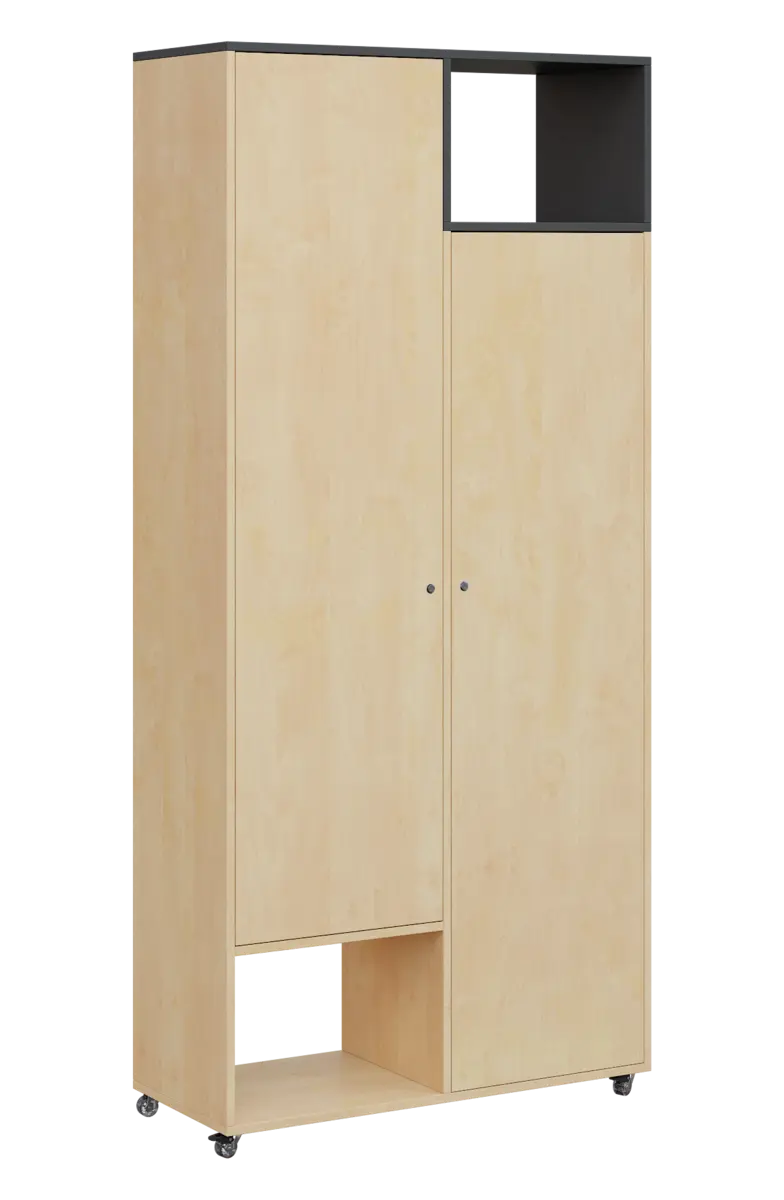 Skříňky z řady AERO lze skvěle kombinovat se stoly tak, aby se vytvořily pracovní prostory v několika výškových rovinách. Pomocí koleček lze vytvářet sestavy dle aktuální potřeby. Pohledová zadní část skříní umožní rozestavění do prostoru.