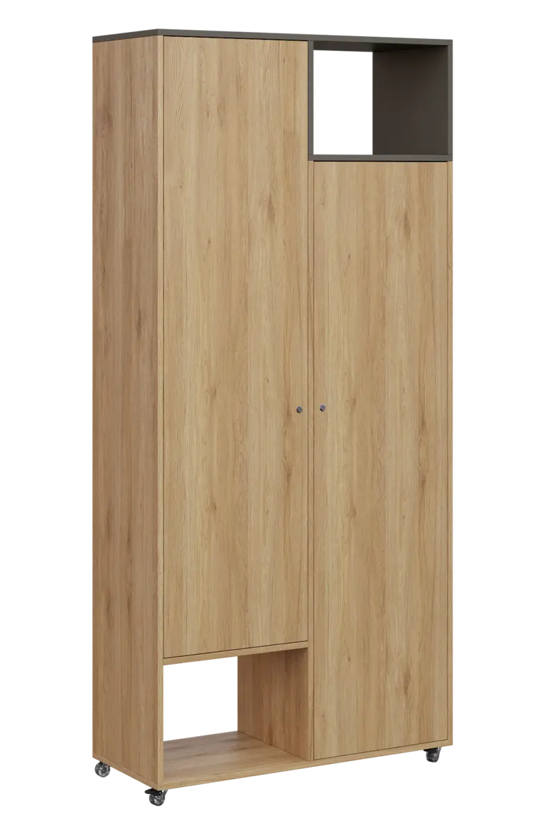 Skříňky z řady AERO lze skvěle kombinovat se stoly tak, aby se vytvořily pracovní prostory v několika výškových rovinách. Pomocí koleček lze vytvářet sestavy dle aktuální potřeby. Pohledová zadní část skříní umožní rozestavění do prostoru.