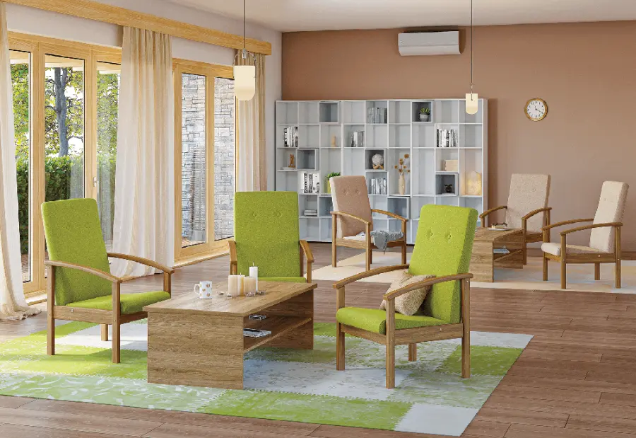 robustní křeslo z dubového dřeva opatřené transparentním lakem, čalouněno v kožence