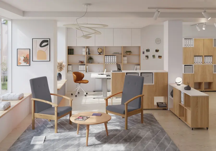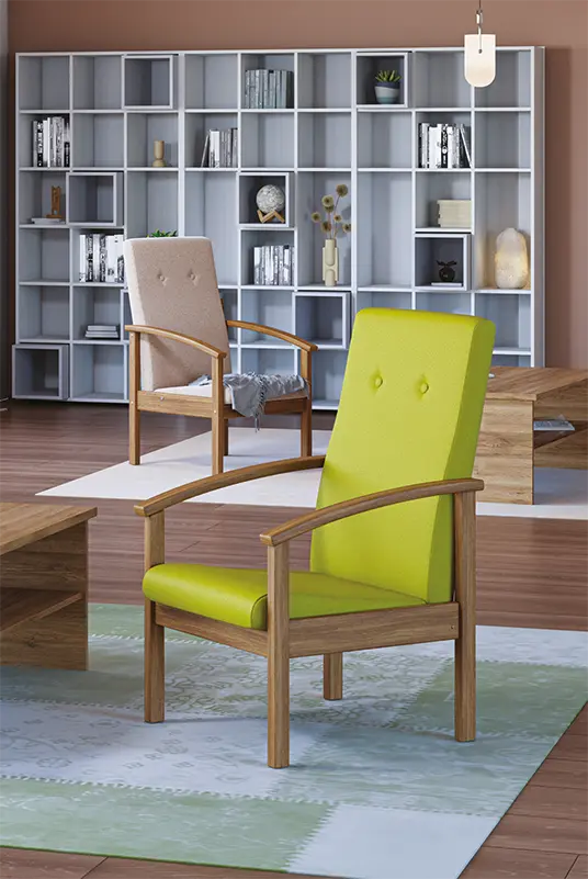 robustní křeslo z dubového dřeva opatřené transparentním lakem, čalouněno v látce