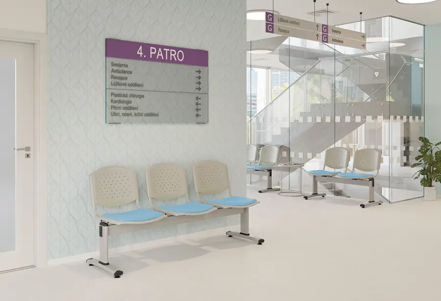 plastová lavice s komfortními čalouněnými sedáky v kožence, stabilní ocelová kostra ve stříbrném laku, perforovaný plastový opěrák