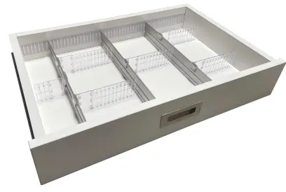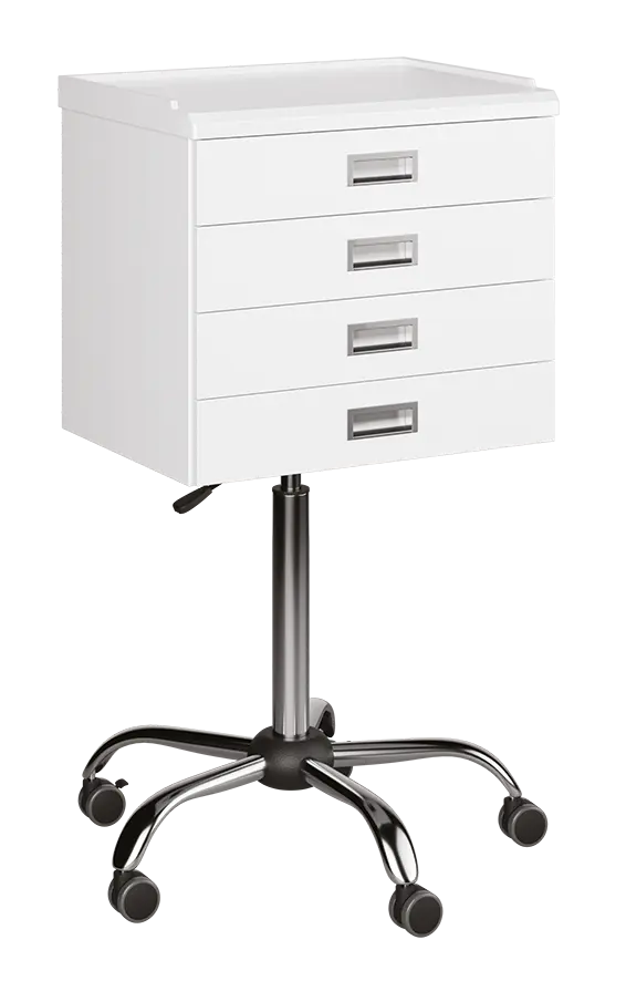 celokovový výškově stavitelný asistenční vozík, plynový píst pro nastavení ideální výšky, opatřený bílou práškovou barvou, vrchní deska z ABS plastu se zvýšeným okrajem zabraňující pádu předmětů
