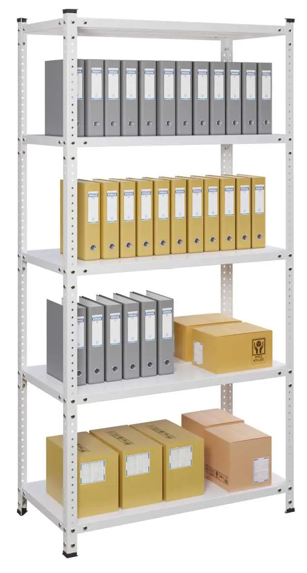 celokovový policový regál vyrobený z odolného plechu, nosnost 150 kg na polici, regály je možné spojovat do regálových řad