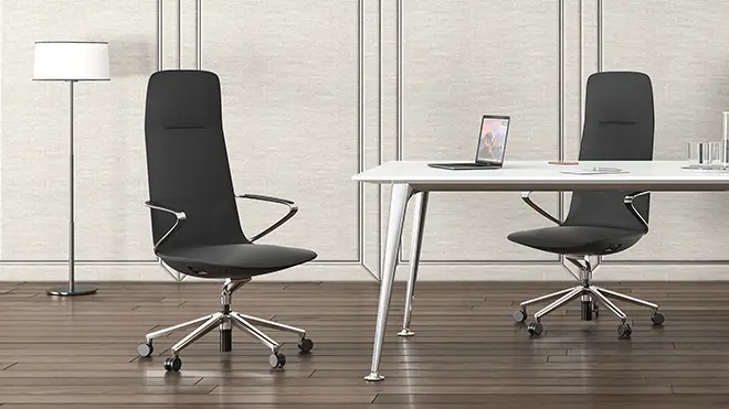 luxusní kancelářské křeslo s vysokým opěrákem, čalounění z jemné kůže té nejvyšší kvality, designový 5-ti ramenný kříž z leštěného hliníku