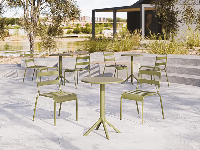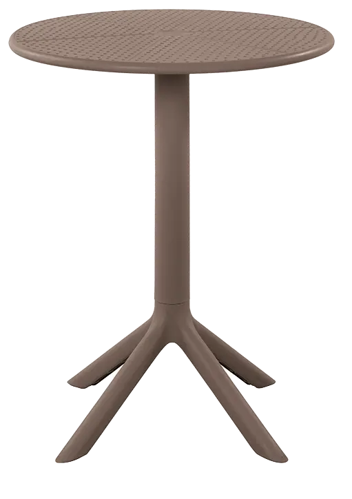 univerzální celoplastový stůl pro exteriér i interiér, kulatá deska s jemnou perforací zajišťuje odtok vody při dešti a zároveň dodává stolu vzdušný a moderní vzhled