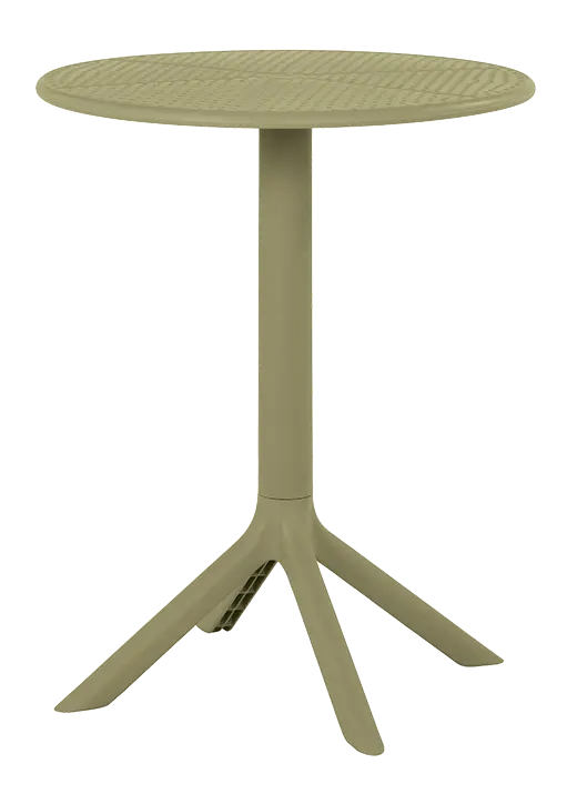 univerzální celoplastový stůl pro exteriér i interiér, kulatá deska s jemnou perforací zajišťuje odtok vody při dešti a zároveň dodává stolu vzdušný a moderní vzhled
