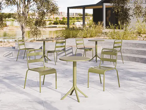 moderní celoplastový stůl navržený primárně pro venkovní použití si díky svému elegantnímu designu najde místo i v interiéru, lamelové provedení horní desky dodává stolu moderní vzhled a usnadňuje odtok vody při dešti
