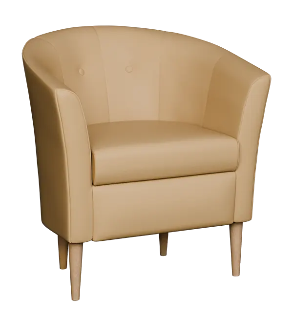 1-místné křeslo v jedinečném designu, zvýšený sed, ručně prošívaný opěrák s ozdobnými knoflíky, dřevěné masivní nohy v barvě přírodního dřeva