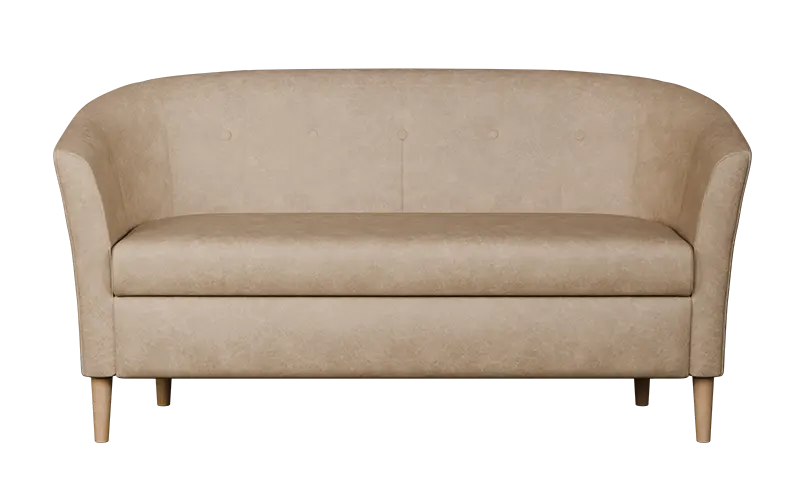 2-místné křeslo v jedinečném designu, ručně prošívaný opěrák s ozdobnými knoflíky, dřevěné masivní nohy v barvě přírodního dřeva