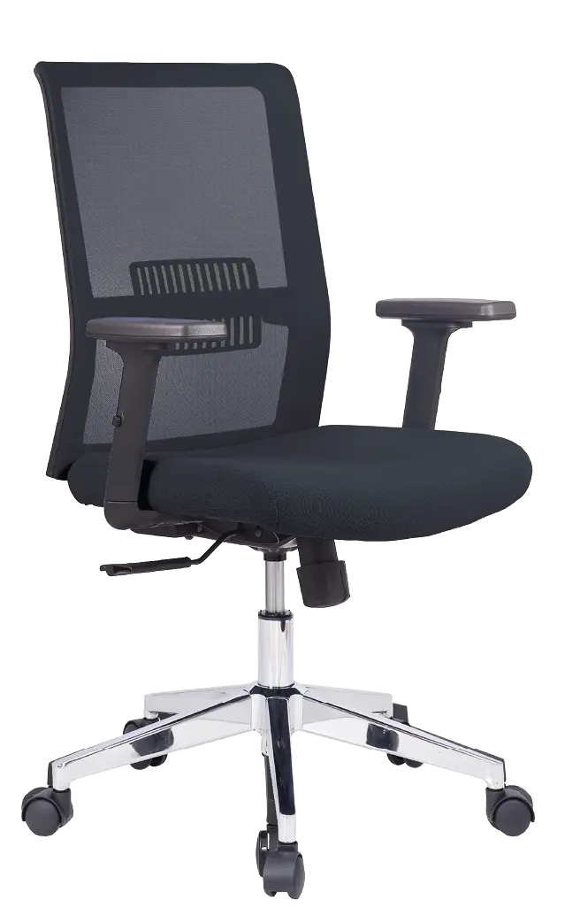 kancelářská židle bez opěrky hlavy, síťovaný opěrák, vyztužený chromovaný kříž, synchronní mechanika s blokací v několika pozicích