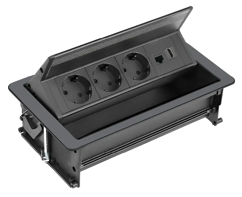 multimediální, zásuvkové centrum pro praktické a estetické řešení přívodu elektřiny, černá, 3x zásuvka, 1x HDMI, 1x LAN