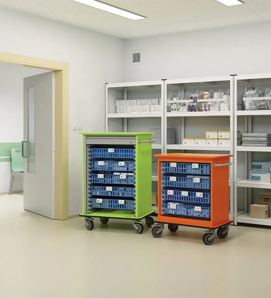 vysoký otevřený vozík s oboustrannýn přístupem, vozík obsahuje: 3× box modrý vel. L a 4× box výklopný modrý vel. M