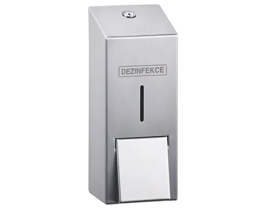 dávkovač na dezinfekční roztok, dávkovače jsou vyrobené z matné nerezové oceli, okénko pro kontrolu hladiny, uzamykatelné na klíček