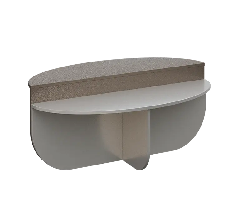 Stoly v této řadě se vyznačují měkce zaoblenými deskami, které podporují ergonomii a pohodlí při práci. Skříně a úložné prvky naopak sází na jednoduché, čisté tvary s decentní elegancí – dvířka jsou posunuta směrem dovnitř a otevírají se pomocí tip-on systému, což podtrhuje minimalistický charakter celé kolekce.