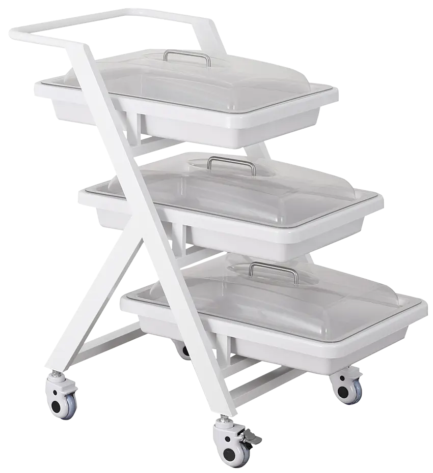 vozík pro bezpečné ukládání a převoz flexibilních endoskopů, svařovaná kostra v bílém laku, 3 vyjímatelné boxy z ABS plastu opatřené víkem s úchytkou