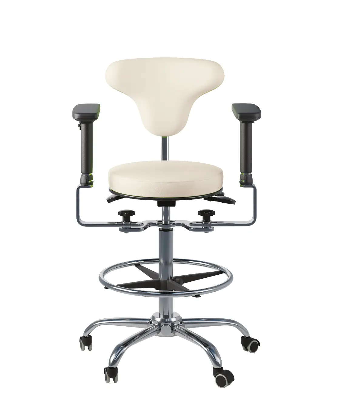 lékařská židle s vyšším sedem, ergonomicky tvarovaná zádová opěrka s nastavením výšky a sklonu, čalouněná ekologickou kůží, nastavitelné vysoké 3D područky