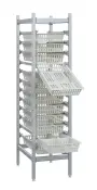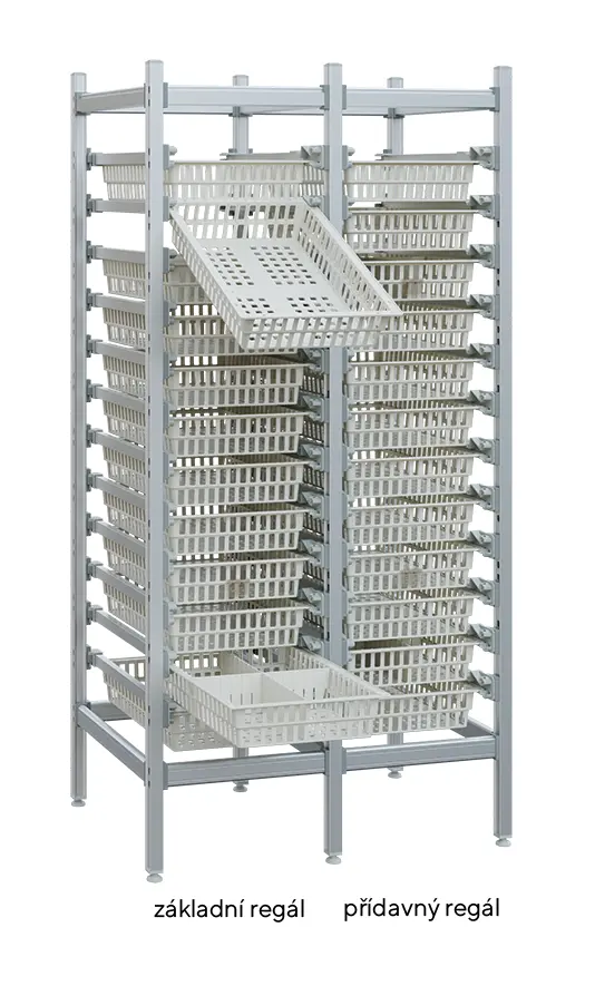 pevné a stabilní hliníkové regály určené pro skladování léků a zdravotnického materiálu, regály EUROMEDICA jsou určené pro koše MEDIBOX nebo pro sterilizační koše a plata STERIL