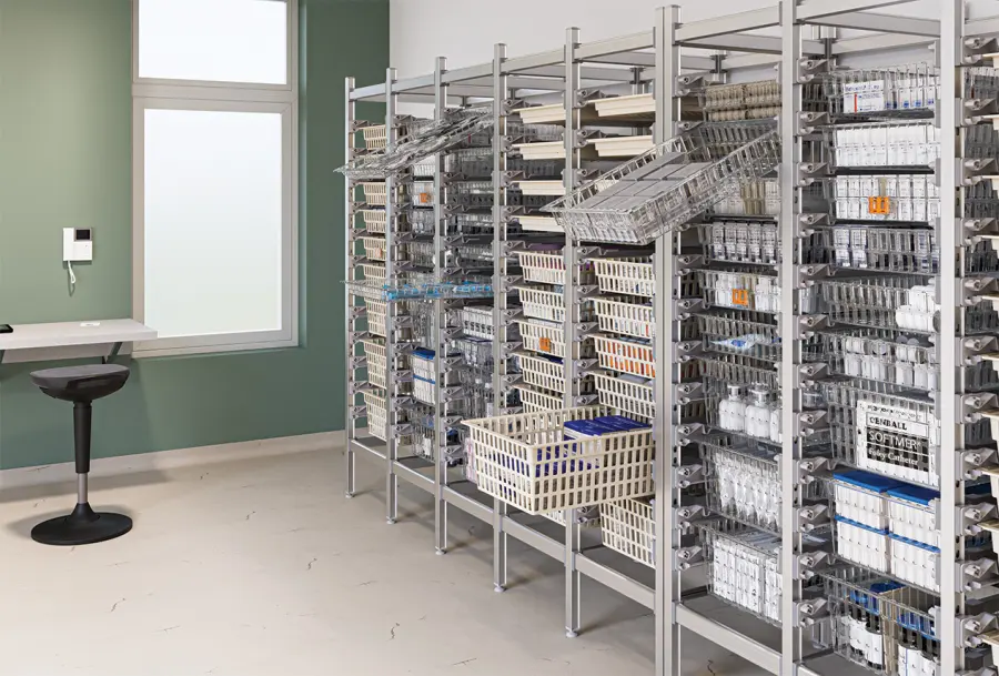 regály EUROMEDICA jsou určené pro koše MEDIBOX nebo pro sterilizační koše a plata STERIL využijete ve skladech zdravotnického materiálu, laboratořích, lékárnách, operačních sálech, centrálních sterilizacích a také na každém nemocničním oddělení