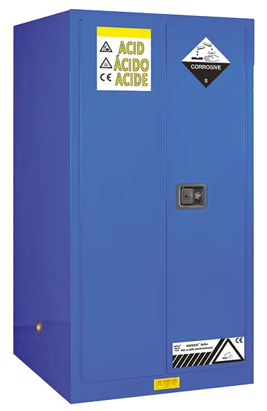 kovová svařovaná skříň s dvouplášťovou konstrukcí pro bezpečné skladování hořlavých látek a chemikálií, skříň má v bocích větrací otvory s tavnými pojistkami