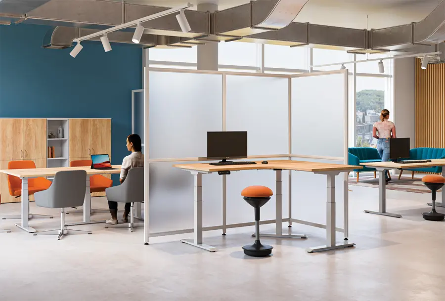 výškově stavitelné stoly, u kterých se nehrbíte, u kterých můžete sedět či stát, prostě pracujte efektivněji a zdravěji, výšku stolů lze jednoduše nastavit pomocí ovládacího panelu