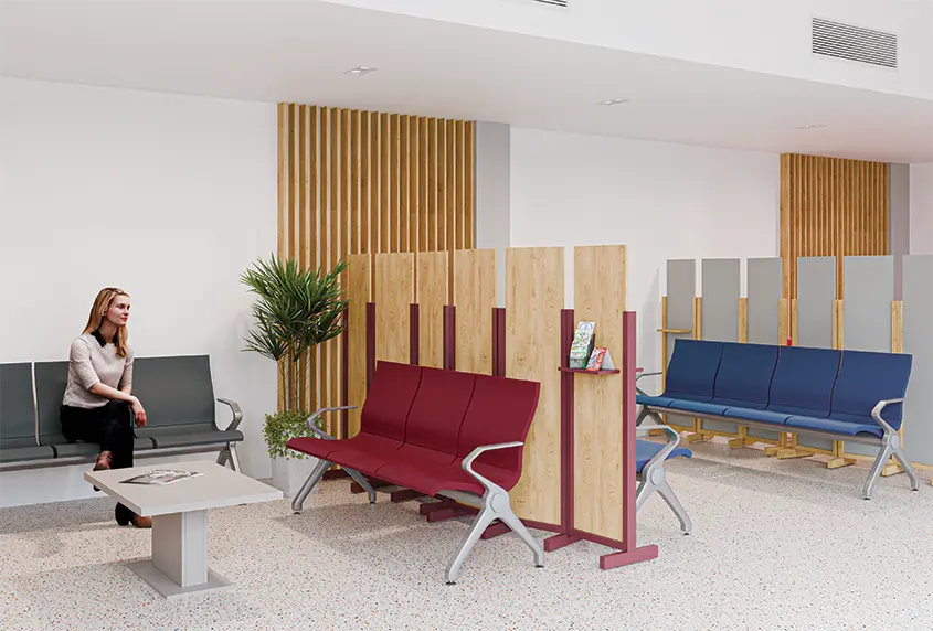 čekárenské lavice s kovovou kostrou opatřenou stříbrnou práškovou barvou, sedák je vyroben z kvalitní polyuretanové pěny, kluzáky pro vyrovnání nerovností podlahy