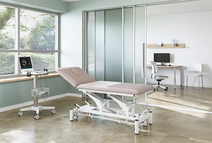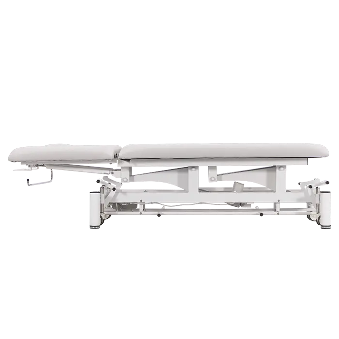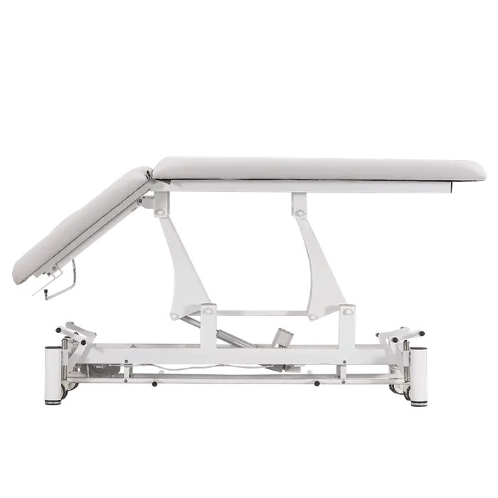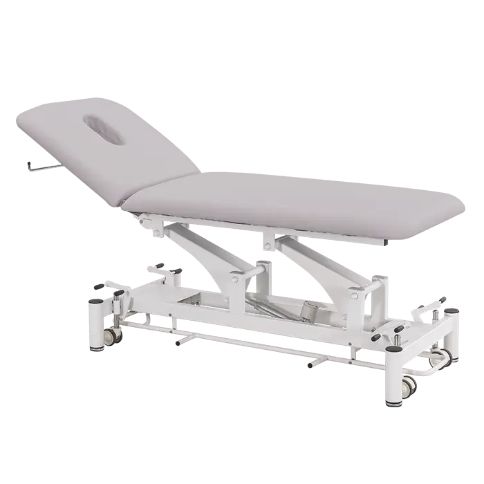 2-segmentové jednomotorové lehátkos elektrickým nastavením výšky stolu, hlavová část s otvorem pro obličej s krycí zátkou, stabilní kovová konstrukce opatřená bílou práškovou barvou