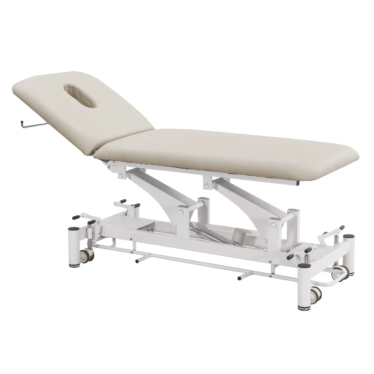 2-segmentové jednomotorové lehátko s elektrickým nastavením výšky stolu, hlavová část s otvorem pro obličej s krycí zátkou, stabilní kovová konstrukce opatřená bílou práškovou barvou