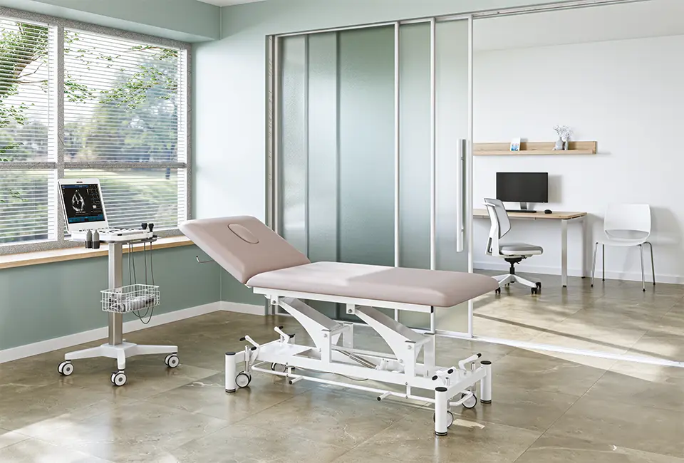 • 2-segmentové jednomotorové lehátko s elektrickým nastavením výšky stolu v rozsahu 470–910 mm pomocí ručního ovladače nebo rámového nožního ovladače