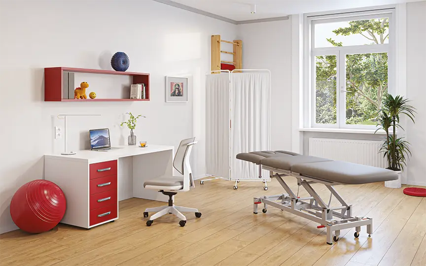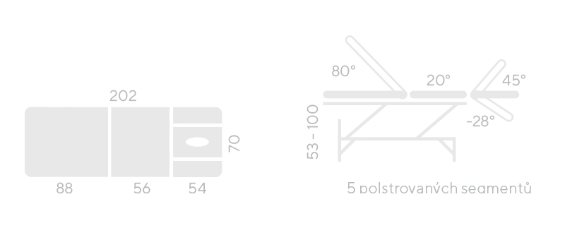 5-segmentové lehátko s elektrickým nastavením výšky stolu, nastavitelný středový a nožní díl el. pohonem, manuálně výškově stavitelné loketní opěrky
