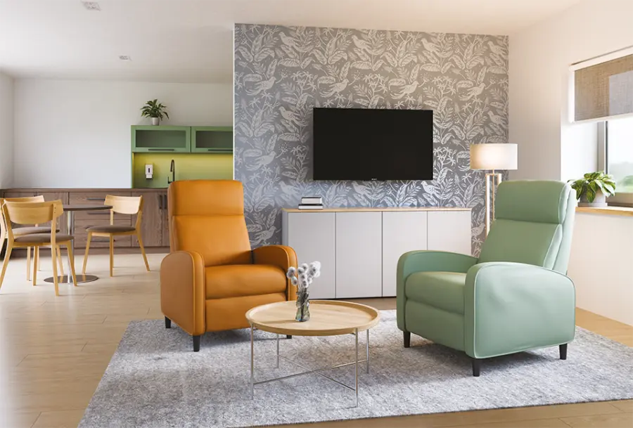 polohovatelné relaxační křeslo s vyklápěcí podnožkou, nohy v černém provedení, čalouněné v látce
