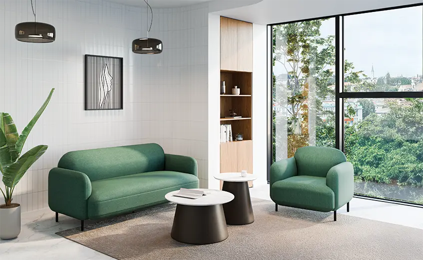 • výrazně polstrovaný sedák, opěrák i široké područky působí plně a útulně. Kovové nohy v černém laku dodávají lehkost a moderní kontrast k oblým tvarům