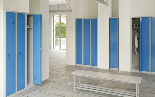 šatní skříně vyrobené z kvalitního ocelového plechu, větrací mřížky ve dveřích pro odvádění vlhkosti z oděvů, místo na jmenovku v horní části, tuhá konstrukce korpusu a speciální horizontální výstuhy ve dveřích