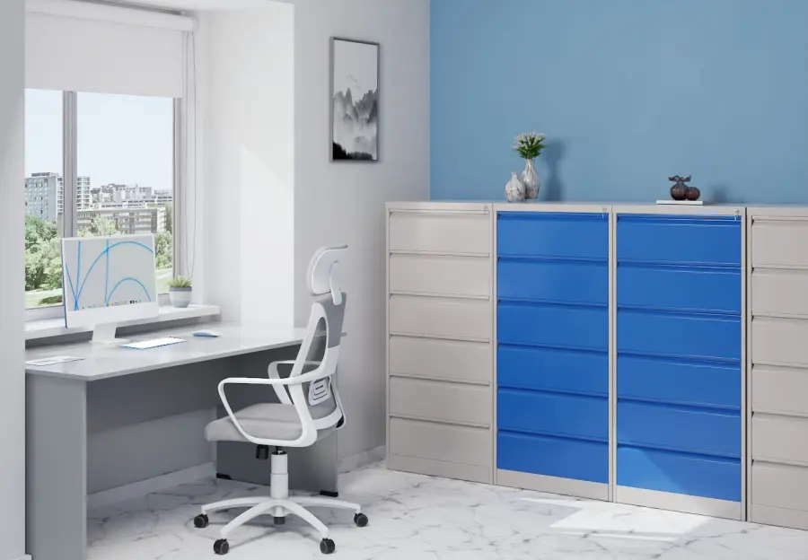 kartotéky vyrobeny z kvalitního ocelového plechu, každá zásuvka má 2 oddělení formátu A5, povrchová úprava práškovou barvou