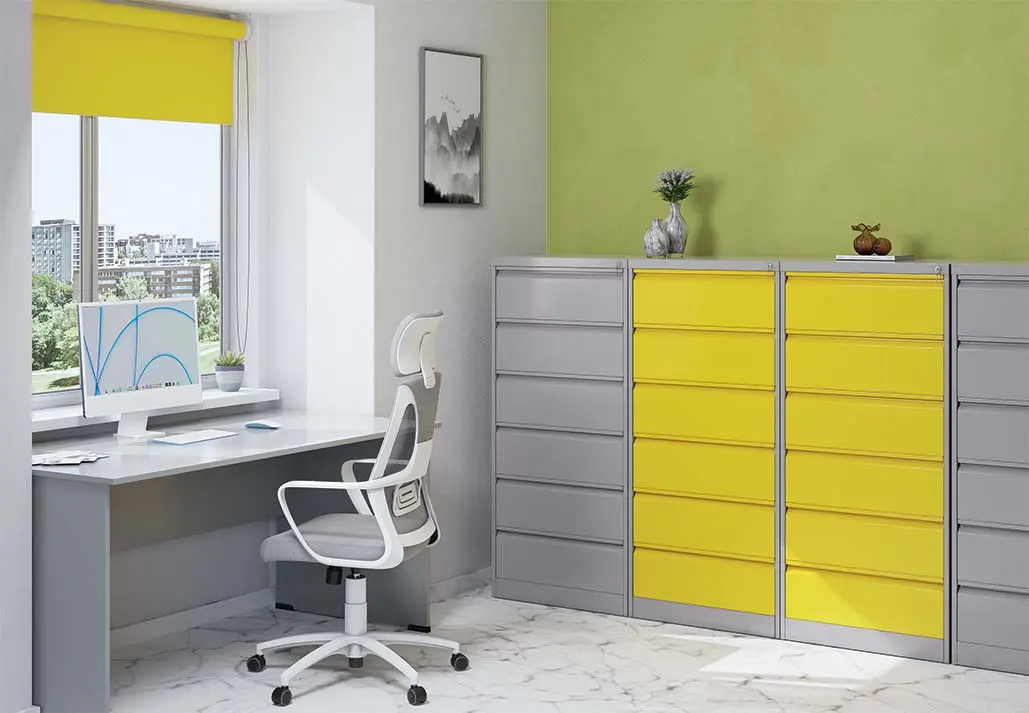 kartotéky vyrobeny z kvalitního ocelového plechu, každá zásuvka má 2 oddělení formátu A5, povrchová úprava práškovou barvou