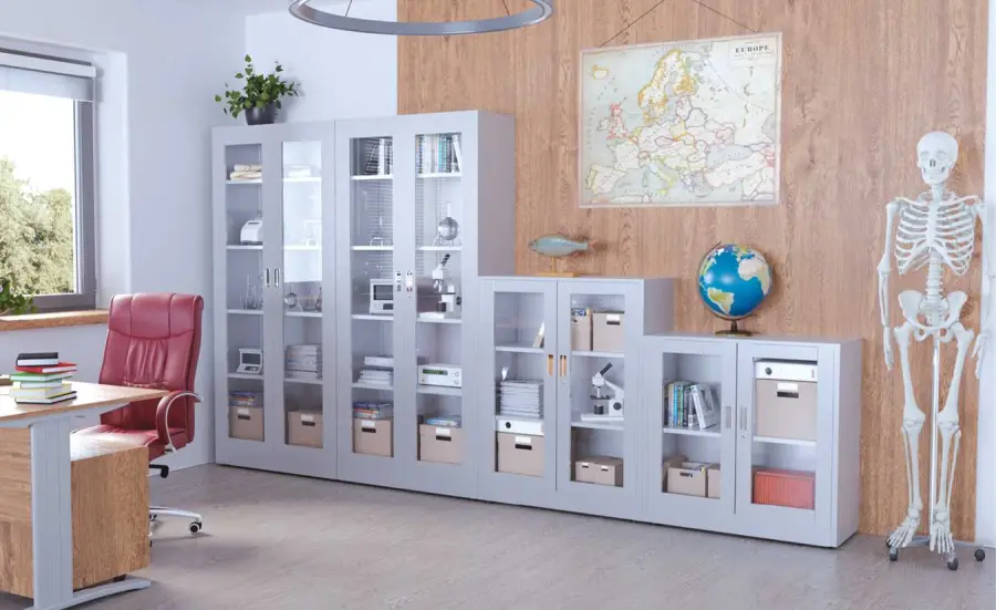 2 -dveřová policová skříň s prosklenými dvířky, uzamykání cylindrickým zámkem