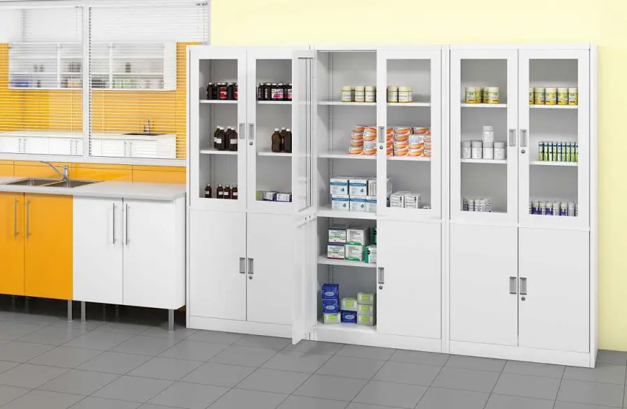 uzamykatelná léková skříň, horní dveře prosklené, vnitřní kovové police
