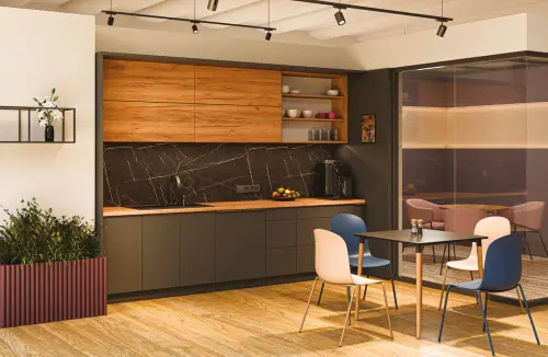 Kuchyňka reprezentuje firmu u zaměstnanců i návštěv a proto jsme se v kuchyňské řadě Cofdate zaměřili na eleganci a vysokou užitnou hodnotu. Neobsahuje pracovní desku viz popis.