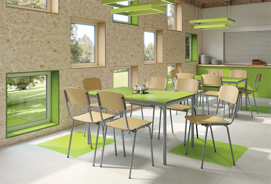 barevný jídelní stůl, 740x1800x800 mm, deska šedá s hranou pastelově růžová, podnož stříbrná