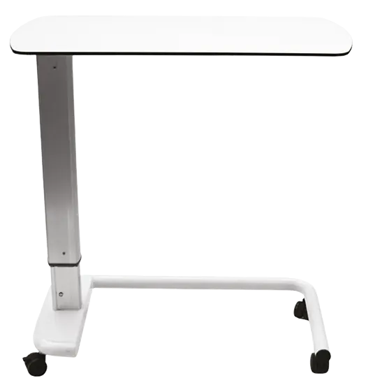 stabilní kovová základna s horní deskou HPL v bílé barvě, hliníkový sloupec, plynový píst pro nastavení výšky