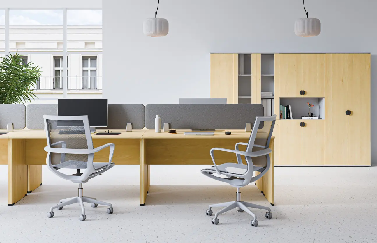 Sestavy vhodné pro vybavení malých i velkoplošných kanceláří. Stoly mají tenčí 18 mm desky a 2 mm voděodolnou hranu. Odlehčené skříňky s užšími 18 mm korpusy i policemi a 3 mm zády jsou ideální ke zdi. Záda v barevném provedení bílá pro dub bardolino a ořech, pro ostatní barvy v barvě dřevodezénu.