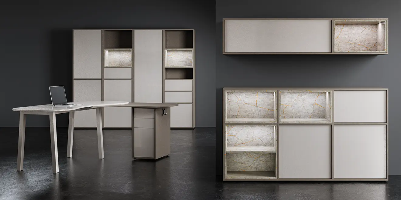 Stoly v této řadě se vyznačují měkce zaoblenými deskami, které podporují ergonomii a pohodlí při práci. Skříně a úložné prvky naopak sází na jednoduché, čisté tvary s decentní elegancí – dvířka jsou posunuta směrem dovnitř a otevírají se pomocí tip-on systému, což podtrhuje minimalistický charakter celé kolekce.