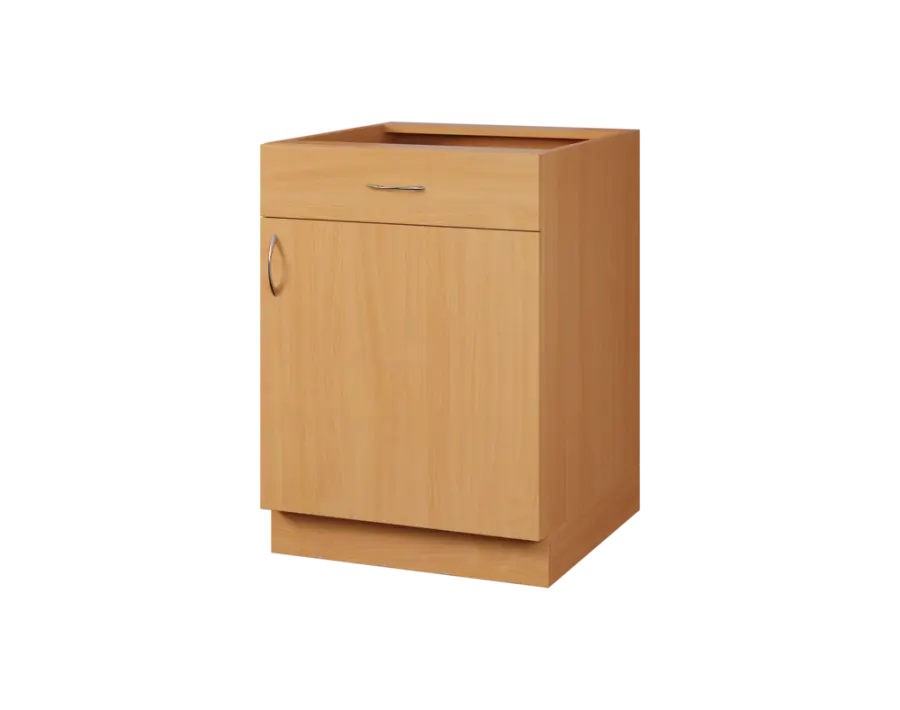 Skříňky jsou pevné, voděodolné, jednoduše dezinfikovatelné, certifikované pro laboratoře. Osadíme dřez, baterii a lednici podle potřeby. Spodní skříňky neobsahují pracovní desku viz popis.
