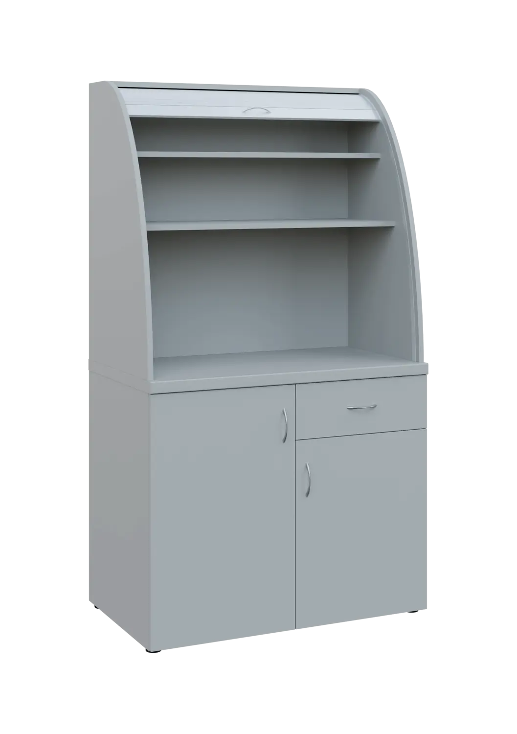 postformingová pracovní deska v šedém provedení, průchodka pro protažení kabelu, na přání lze vybavit zámkem